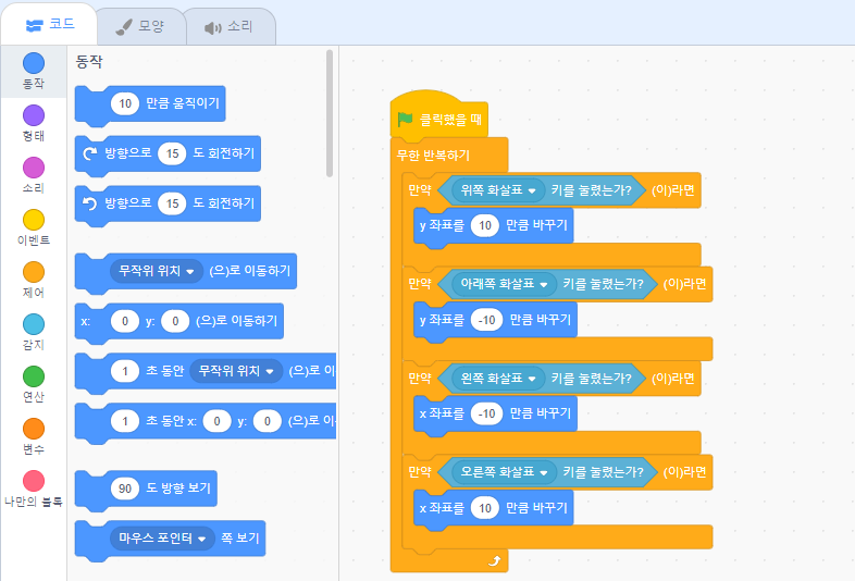Step7. 키보드 방향키에 맞춰 ( )좌표를 ( ) 만큼 바꾸기 블록을 사용한다.