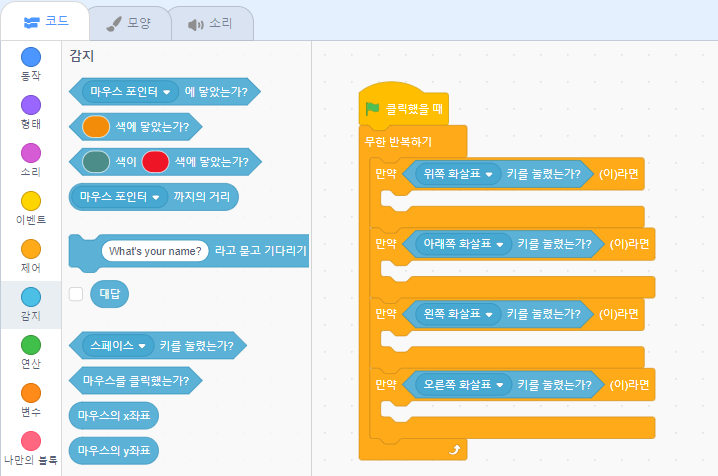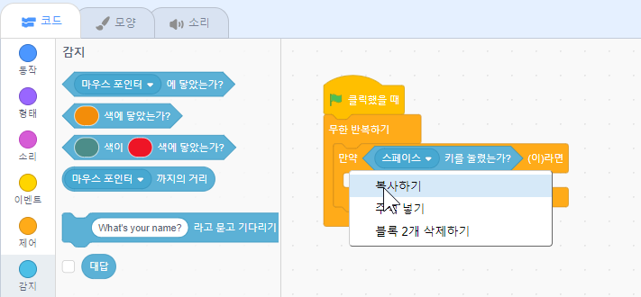 Step4. "감지" 블럭 모음에서 "스페이스 키를 눌렀는가?" 블록을 추가한다.