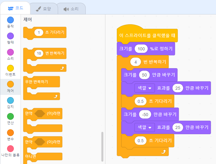 Step3. 글자 스프라이트를 클릭했을 때 0.5초 마다 글자가 커졌다 작아졌다를 4번 반복하도록 만들어 보겠습니다. 이때 글자의 색깔도 바뀌도록 블록을 추가합니다.