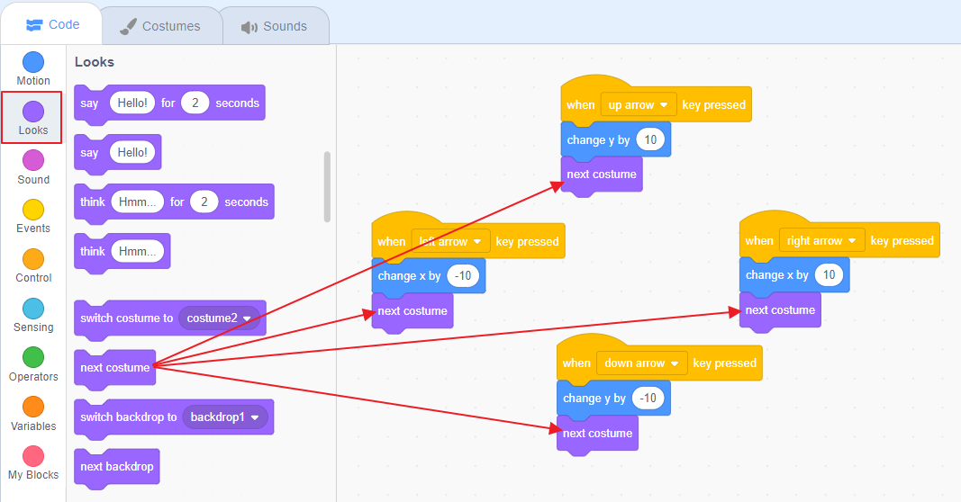 Step5. To use "next costume" in a collection of "Looks" blocks.