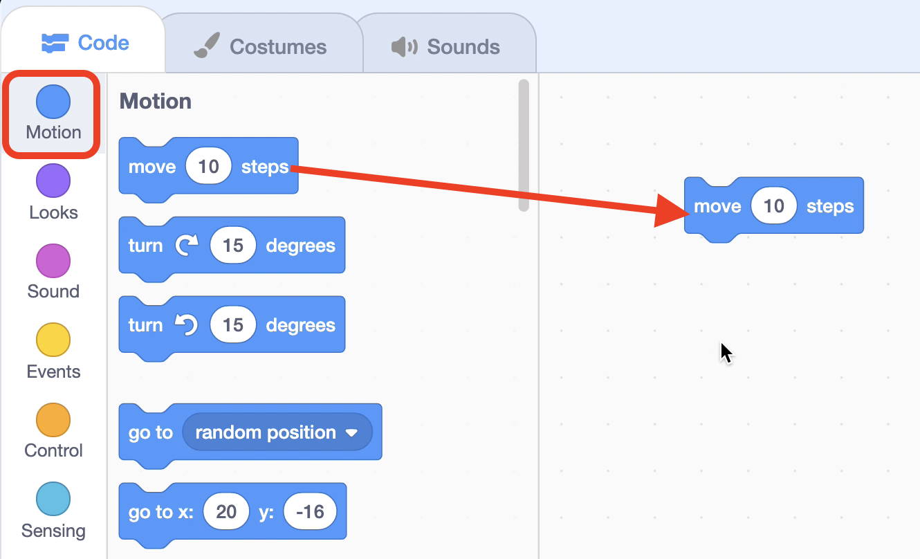 Step4. Select the "move 10 steps" block from the "Motion" block bar.