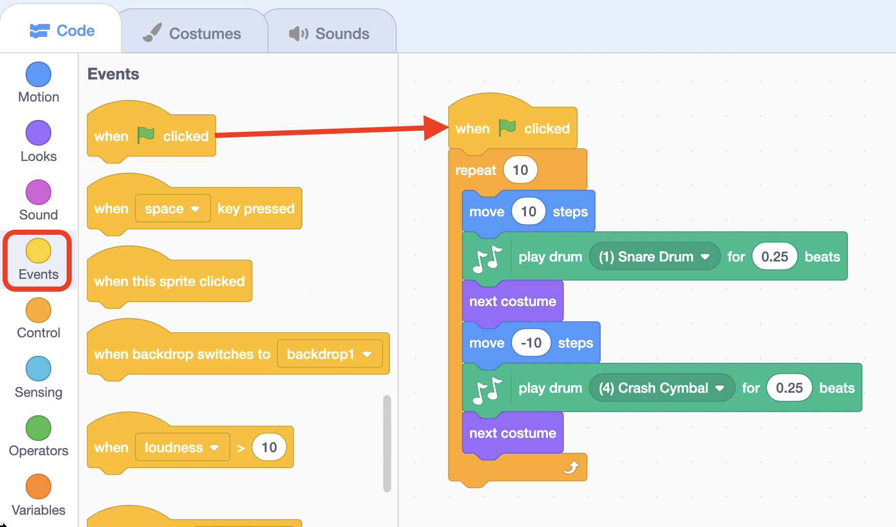 Step7. From the "Music" block collection, select the block "play drum (1) Snare Drum for 0.25 beats" and connect it under the "move 10 stpes" block.