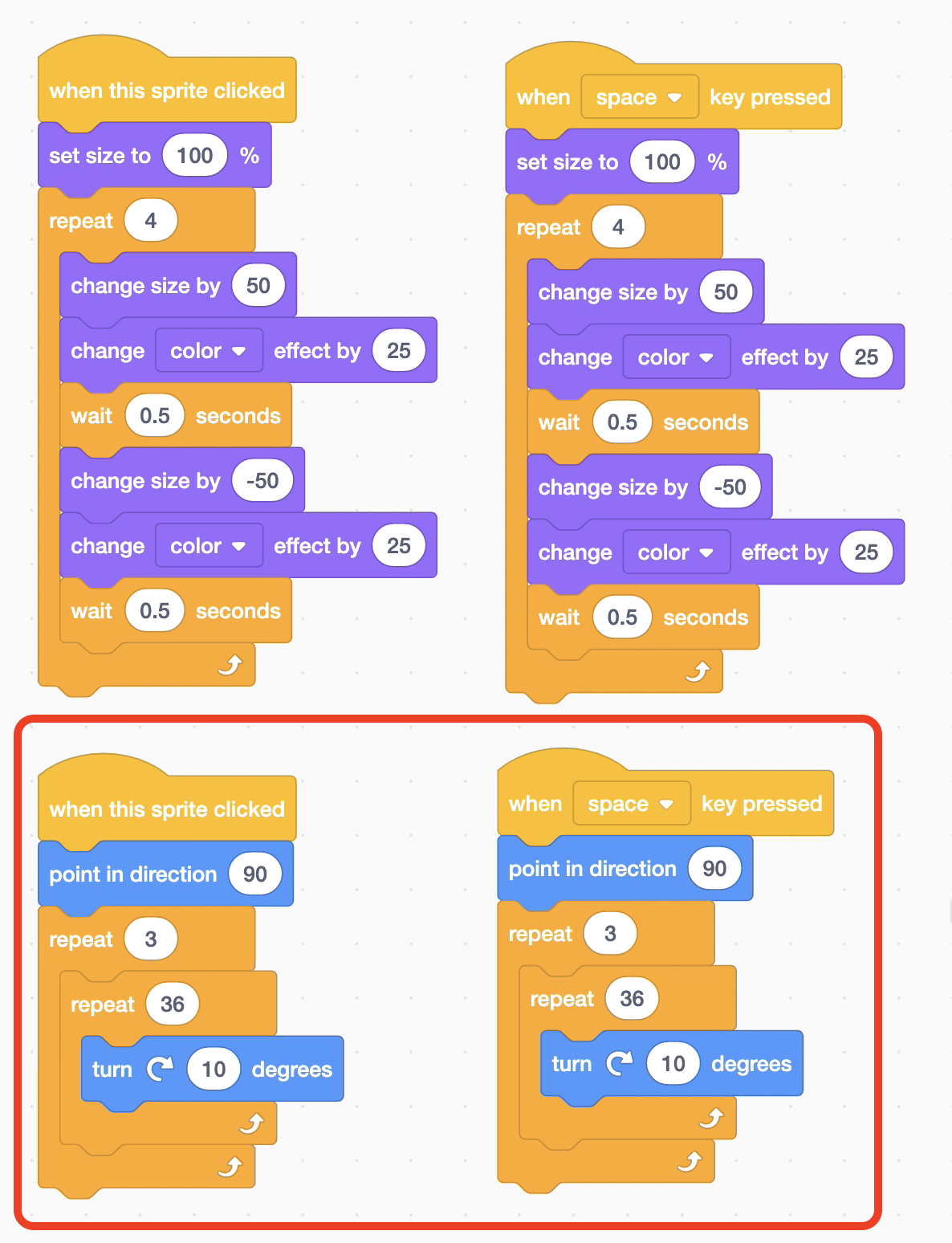 Step3. When you click on the letter sprite, we're going to make it four times, every half second, the letter gets bigger and smaller. Add blocks to change the color of the letters.