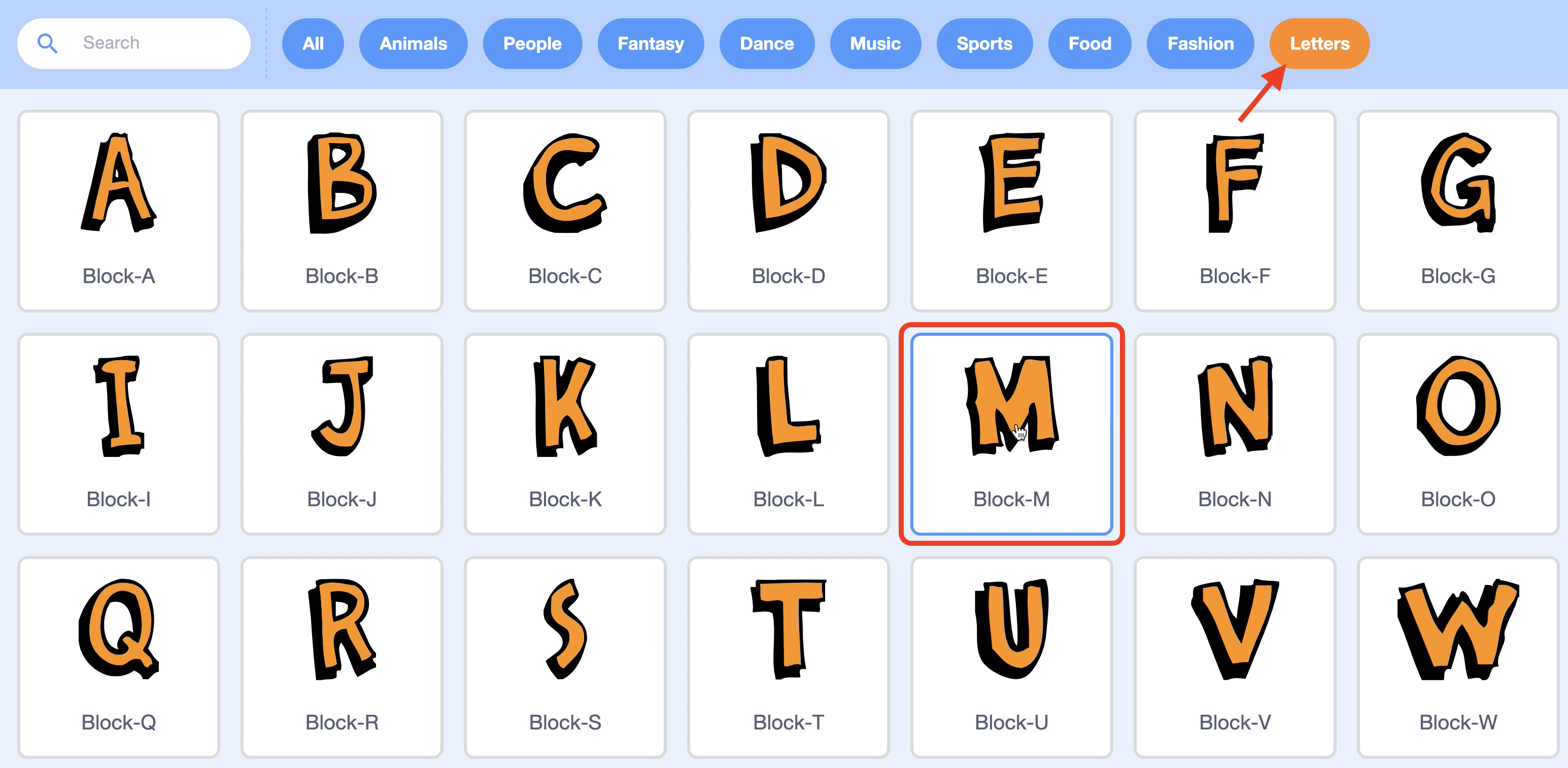 Step2. Select a "Letters" category in Select Sprite and add one letter. I'll choose "M"
